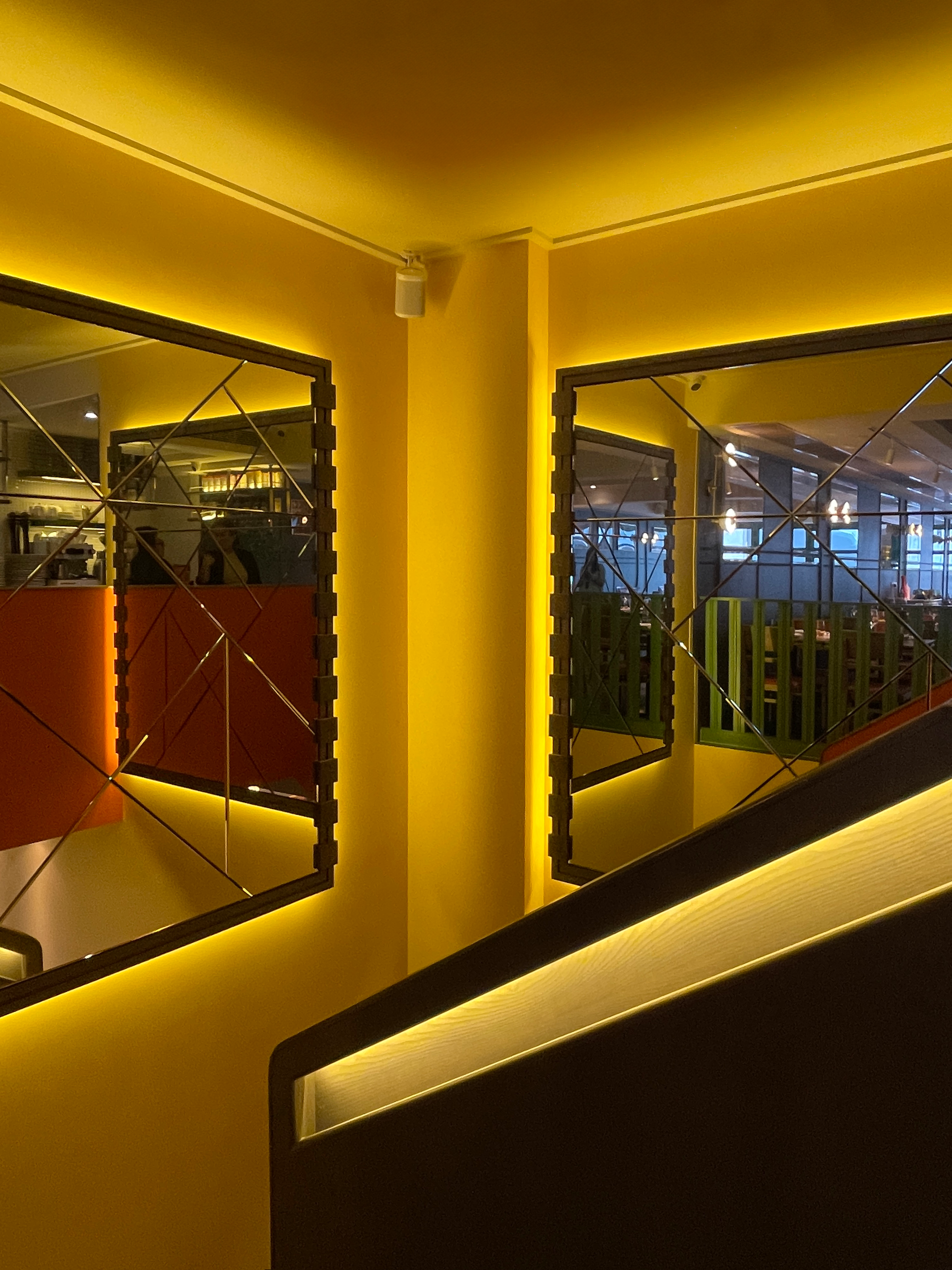Thoughtfully selected custom lighting fixtures enhance the mid-century modern aesthetic, providing both ambient and task lighting that highlights the restaurant's architectural features. Elegant furnishings combine modern and retro-inspired pieces designed for comfort and style, complementing the overall aesthetic. The bar area serves as a focal point with its sleek design and well-organized layout, offering guests a perfect spot to enjoy a fine selection of Italian wines and cocktails. At 208 Italian, the design not only elevates the visual appeal but also enhances the overall dining experience, with a thoughtfully planned layout ensuring a seamless flow that allows guests to enjoy a sense of privacy while still feeling connected to the vibrant atmosphere of the restaurant.
